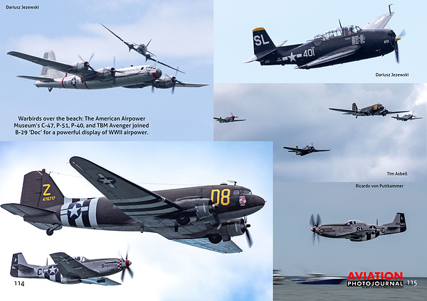 Warbirds over the beach: The American Airpower Museum’s C-47, P-51, P-40, and TBM Avenger joined B-29 ‘Doc’ for a powerful display of WWII airpower.