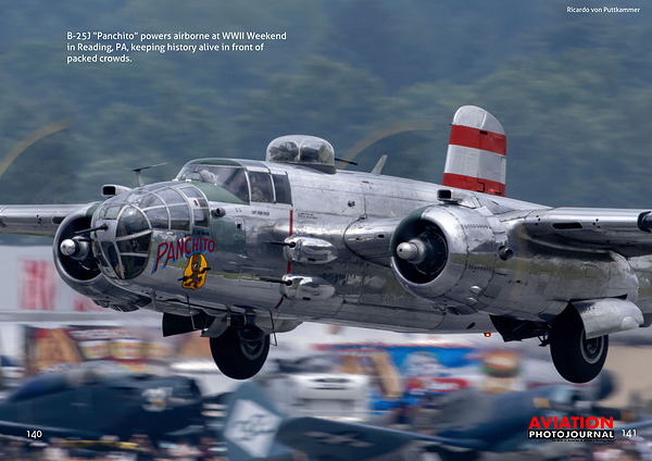 B-25J “Panchito” powers airborne at WWII Weekend in Reading, PA, keeping history alive in front of packed crowds.