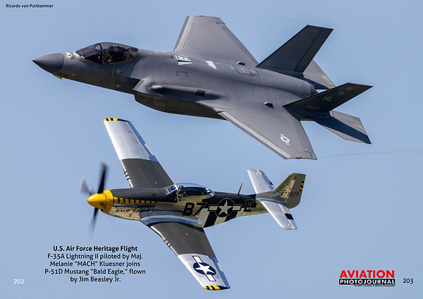 F-35A Lightning II piloted by Maj. Melanie “MACH” Kluesner joins P-51D Mustang “Bald Eagle,” flown by Jim Beasley Jr.