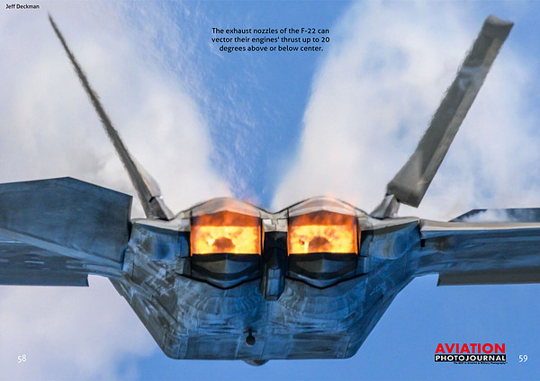 The exhaust nozzles of the F-22 can vector their engines' thrust up to 20 degrees above or below center.