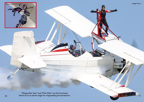 "Wingwalker Sam" and "Pilot Mike" use the Grumman ShowCat as an aerial stage for wingwalking and aerobatics.