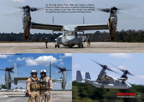 An MV-22B Osprey from VMM-162, based at Marine Corps Air Station New River, arrived on rehearsal day as an early visitor to the field. The aircraft was passing through the area while on a routine training mission.