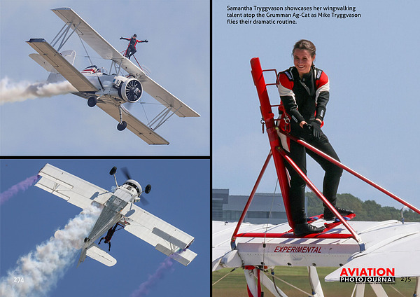 Samantha Tryggvason showcases her wingwalking talent atop the Grumman Ag-Cat as Mike Tryggvason flies their dramatic routine.