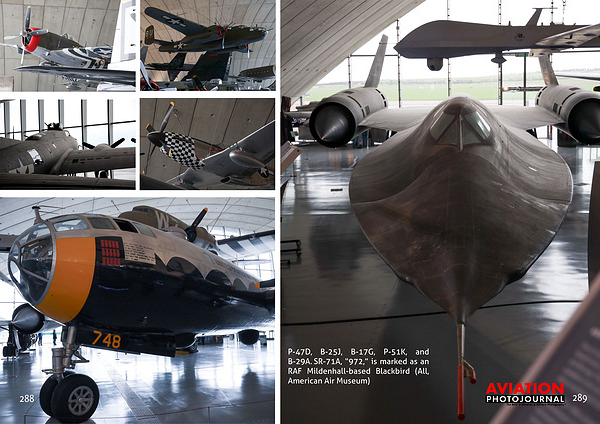 P-47D, B-25J, B-17G, P-51K, and B-29A. SR-71A, “972,” is marked as an RAF Mildenhall-based Blackbird (All, American Air Museum)