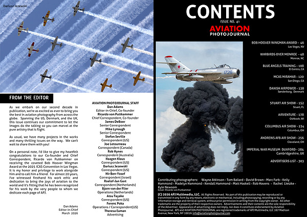 (C) 2026 APJ Multimedia, LLC. All Rights Reserved. No part of this publication may be reproduced or transmitted in any form by any means, electronic or mechanical, including photocopying, recording or by any information storage and retrieval system, without prior permission in writing from the copyright owner. All other trademarks are the property of their respective owners. Advertisements and their contents are the sole responsibility of the Advertiser. Appearance of advertising does not imply, nor does it constitute endorsement by Aviation Photojournal. APJ and AVIATION PHOTOJOURNAL are registered trademarks of APJ Multimedia, LLC 167 Madison Avenue, New York, NY 10016 info@aviationphotojournal.com
