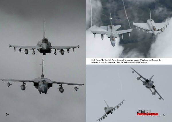 Both Pages: The Royal AIr Force shows off its one-two punch. A Typhoon and Tornado fly together in a potent formation. Note the weapons load on the Typhoon.