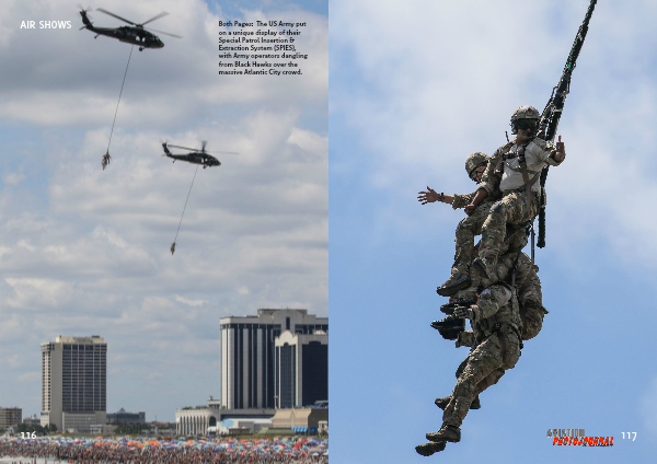 Both Pages: The US Army put on a unique display of their Special Patrol Insertion & Extraction System (SPIES), with Army operators dangling from Black Hawks over the massive Atlantic City crowd.