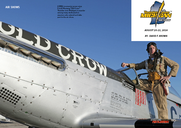A WW2 re-enactor poses atop P-51D Mustang "Old Crow." Thunder over Michigan is popular among many dedicated re-enactors who attend and take part in the air show.