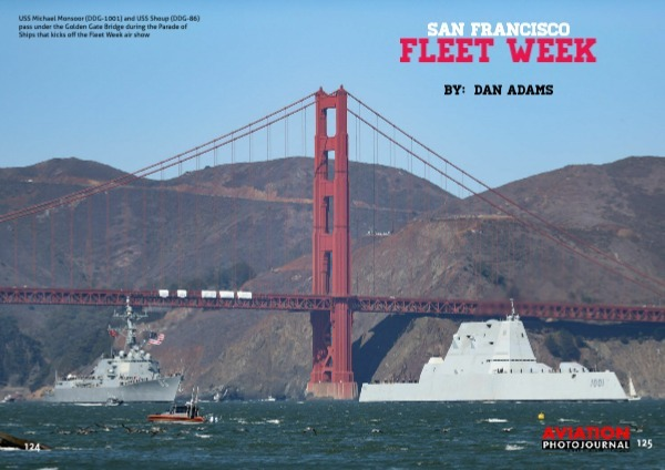 USS Michael Monsoor (DDG-1001) and USS Shoup (DDG-86) pass under the Golden Gate Bridge during the Parade of Ships that kicks off the Fleet Week air show