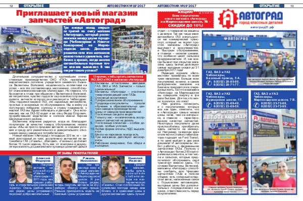 Всем покупателям нового магазина « Автоград » на Марпосадском шоссе, 7В – скидки до 10 %! автоград21. рф отдел – с товарами на машины с дизелем. Так как чаще всего автомобили ГАЗ используются как коммерческий транспорт, который не терпит простоя, магазины « Автоград » выручают и ассортиментом, и быстрым обслуживанием, а главное – низкими ценами, что особенно ценят сельские предприниматели. И, как всегда бывает при открытии магазина, здесь сейчас действуют самые выгодные скидки до 31 декабря 2017 года!