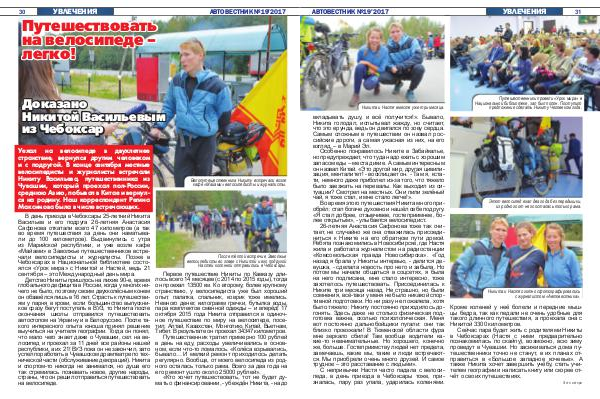 вкладывать душу, и всё получится!». Бывало, Никита голодал, испытывал жажду, но считает, что это ерунда, ведь он двигался по зову сердца. Самым сложным в путешествии он назвал российские дороги, а самая ужасная из них, на его взгляд, – в Марий Эл.