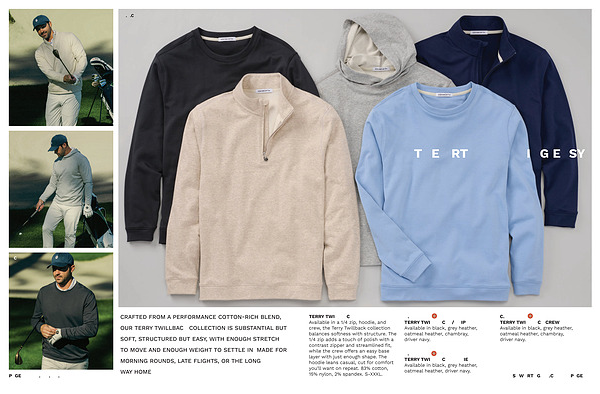 TERRY TWILLBACK Available in a 1 / 4 zip, hoodie, and crew, the Terry Twillback collection balances softness with structure. The 1 / 4 zip adds a touch of polish with a contrast zipper and streamlined fit, while the crew offers an easy base layer with just enough shape. The hoodie leans casual, cut for comfort you’ ll want on repeat. 83 % cotton, 15 % nylon, 2 % spandex. S-XXXL.