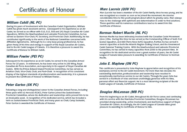 Subsequent to his experience as an Air Cadet, he served in the Canadian Armed Forces for 25 years. In retirement, he has been very active in 200 Wing, Royal Canadian Air Force Association, and especially in its support of Royal Canadian Air Cadets. With the Prince Edward Island Provincial Committee, he has served as Aviation Chair, Vice-Chair, Chair, and Past-Chair. In recognition of his consistent display of the highest standards of professionalism and leadership, it is a pleasure to present the Certificate of Honour to William Fowler. .