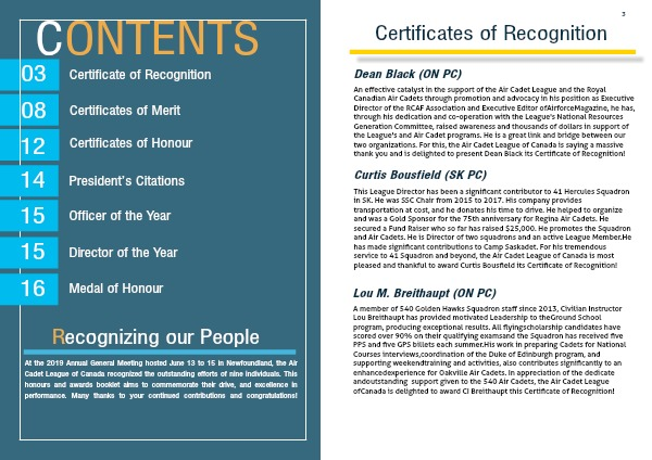 At the 2019 Annual General Meeting hosted June 13 to 15 in Newfoundland, the Air Cadet League of Canada recognized the outstanding efforts of nine individuals. This honours and awards booklet aims to commemorate their drive, and excellence in performance. Many thanks to your continued contributions and congratulations!