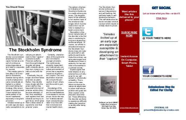 Knowledge of the Stockholm Syndrome and its manifestations is necessary to survive prison; those who are not“ institutionalized” must conscientiously labor to survive with their emotional and mental health intact.