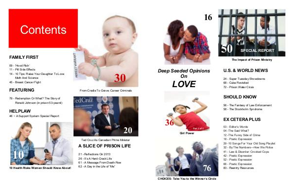 03- Editor’ s Words 04-The Said What? 12-The Funny Side of Crime 18- Poetic Expression 29-10 Songs For Your Old Song Playlist 32- By The Numbers— How We Police 41- Law & Disorder: Crooked Cops 42- Poetic Expression 52- Poetic Expression 66- Poetic Expression 83- Reentry Resources