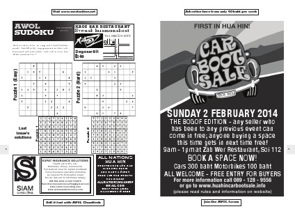 Visit www.awolonline.net it’s number kaoz! kaoz bar restaurant Svensk husmanskost Tel. 092 514 4070 X Dagensrätt ฿149 Phetkasem Rd. Puzzle 2 Puzzle 1 Last issue’s solutions 150m Puzzle 2 (Hard) Puzzle 1 (Easy) Each week we have an easy and a hard Sudoku puzzle. Just fill in the empty squares so that each horizontal and vertical line, and each section, has all the numbers 1 to 9. 7-11 Soi 94 AWOL Sudoku 8 EXPAT INSURANCE SOLUTIONS Health (up to 85), Car, Motorbike, House, Commercial. Full medical cover for expats worldwide Travel insurance specialist (including as required for Schenghen visas) Soi 94, last unit on left before railway 085 962 2232 or 032 512075 franckracinesiamconsulting@gmail.com www.siam-consulting.asia www.asiaexpatinsurance.com ALL NATIONS hua hin guesthouse and bar 12 rooms from 350 baht a night free wifi for guests 032 512747 allnationshuahin@ gmail.com Drop your AWOL Classifieds in here Sell it fast with AWOL Classifieds