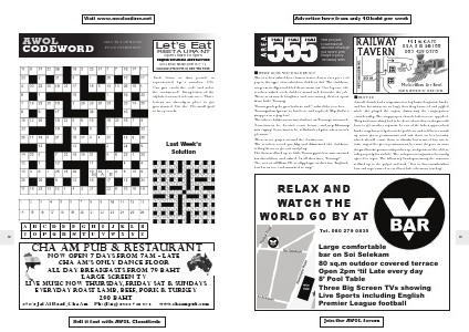 Visit www.awolonline.net AWOL codeword an a to z of good food at let’s eat Let’s Eat RESTAURANT Open 9am to 9pm English Breakfast and Thai Food Soi 3 Khao Takiab (next to 7-11) Call 082 248 0345 or 089 450 5755 Each letter in this puzzle is represented by a number 1-26. Can you crack the code and solve the crossword? Every letter of the alphabet is used at least once. Three letters are already in place to get you started. Use the 1-26 small grid to keep track. Last Week’s Solution 12 A N B O C P D Q E R F S G H T U I J K V W X L Y M Z CHA AM PUB & RESTAURANT Now Open 7 Days From 7am - Late CHA AM’S ONLY DANCE FLOOR All Day Breakfasts from 79 Baht LARGE SCREEN TV Live Music Now Thursday, Friday Sat & Sundays Everyday Roast Lamb, Beef, Pork & Turkey 290 baht 252/6 Jai Ai Road, Cha Am Ph: (Eng) 0822 510 871 www.chaampub.com Sell it fast with AWOL Classifieds