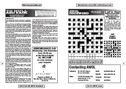 Advertise here for as little as 40 baht per week AWOL codeword an a to z of good food at let’s eat Let’s Eat RESTAURANT Open 9am to 9pm English Breakfast and Thai Food Soi 3 Khao Takiab (next to 7-11) Call 082 294 5602 Each letter in this puzzle is represented by a number 1-26. Can you crack the code and solve the crossword? Every letter of the alphabet is used at least once. Three letters are already in place to get you started. Use the 1-26 small grid to keep track. Last Issue’s Solution A N B O C P D Q E R F S G H T U I J K V W X L Y M Z 17 Contacting AWOL Telephone: 081 649 8361 (Eng) or 081 614 8728 (Thai) Email: info@awolonline.net Website: www.awolonline.net Office: Facebook: AWOLexpat Twitter: awolhuahin 136/229 Emerald Hill, Soi 6, Borfai, Hua Hin, 77110, Prachuap Kiri Khan Join the AWOL forum