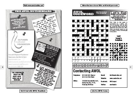 Advertise here for as little as 40 baht per week AWOL codeword an a to z of good food at let’s eat Let’s Eat RESTAURANT Open 9am to 9pm English Breakfast and Thai Food Soi 3 Khao Takiab (next to 7-11) Call 082 294 5602 Each letter in this puzzle is represented by a number 1-26. Can you crack the code and solve the crossword? Every letter of the alphabet is used at least once. Three letters are already in place to get you started. Use the 1-26 small grid to keep track. Last Issue’s Solution A N B O C P D Q E R F S G H T U I J K V W X L Y M Z 17 Contacting AWOL Telephone: 081 649 8361 (Eng) or 081 614 8728 (Thai) Email: info@awolonline.net Website: www.awolonline.net Office: Facebook: AWOLexpat Twitter: awolhuahin 136/229 Emerald Hill, Soi 6, Borfai, Hua Hin, 77110, Prachuap Kiri Khan Join the AWOL forum