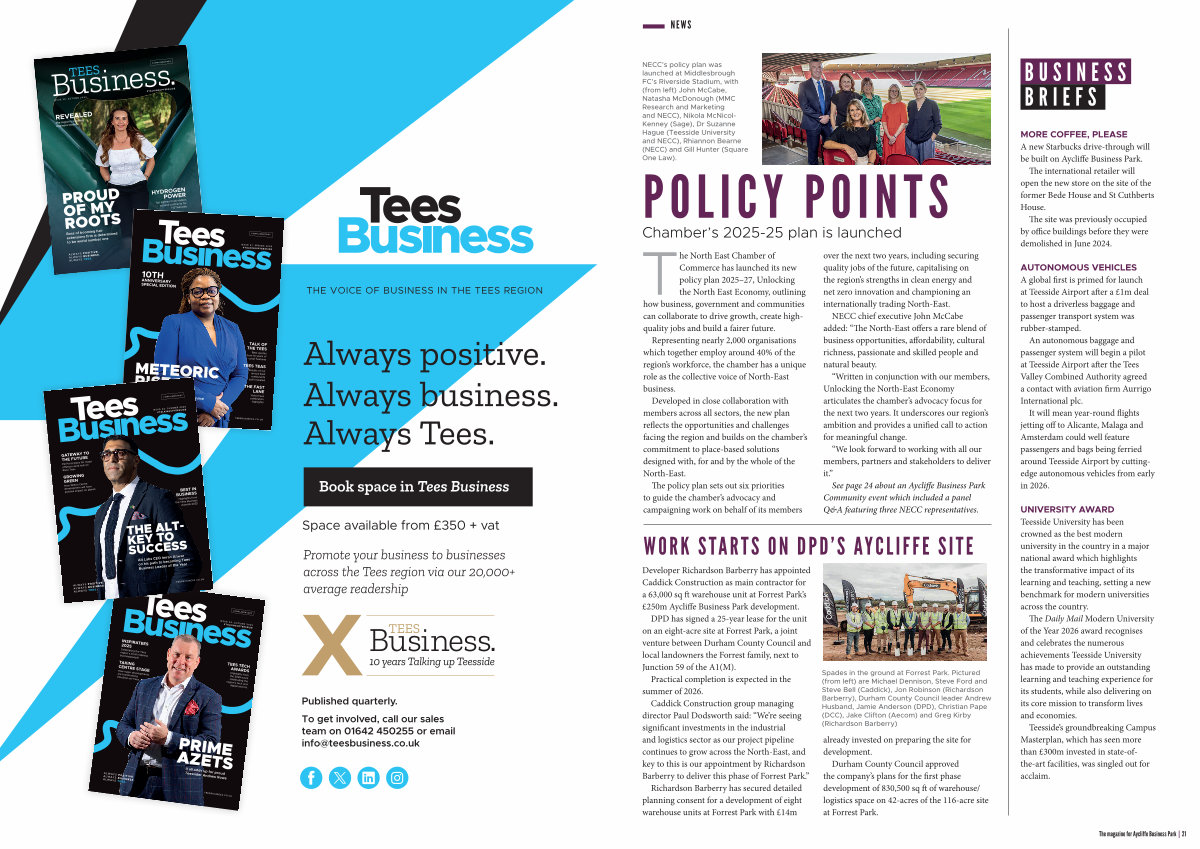 The North East Chamber of Commerce has launched its new policy plan 2025 – 27, Unlocking the North East Economy, outlining how business, government and communities can collaborate to drive growth, create highquality jobs and build a fairer future.