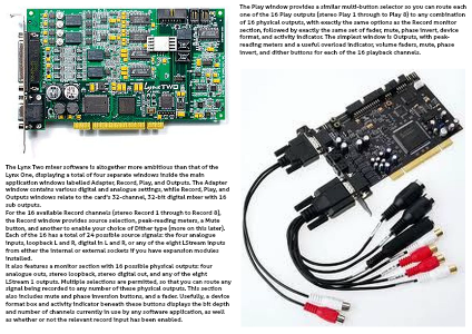 The Play window provides a similar multi-button selector so you can route each one of the 16 Play outputs (stereo Play 1 through to Play 8) to any combination of 16 physical outputs, with exactly the same options as the Record monitor section, followed by exactly the same set of fader, mute, phase invert, device format, and activity indicator. The simplest window is Outputs, with peak-reading meters and a useful overload indicator, volume faders, mute, phase invert, and dither buttons for each of the 16 playback channels.
