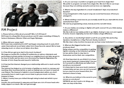 P.M Project was established in 2007 and began releasing music in early 2010 under international record label called SoSo Deep Records owned. We’ve been releasing music on other record labels since then.