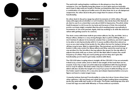 The well-built casing inspires confidence in the player as does the skip resistance. You can literally bang the player on your table and you basically won’t hear it skip until you break it. Pioneer accomplishes this near miracle with a combination of a skip-proof buffer and a CD drive that sits in an oil-dampened suspension. No other deck in the price range that I’m aware of has this functionality.