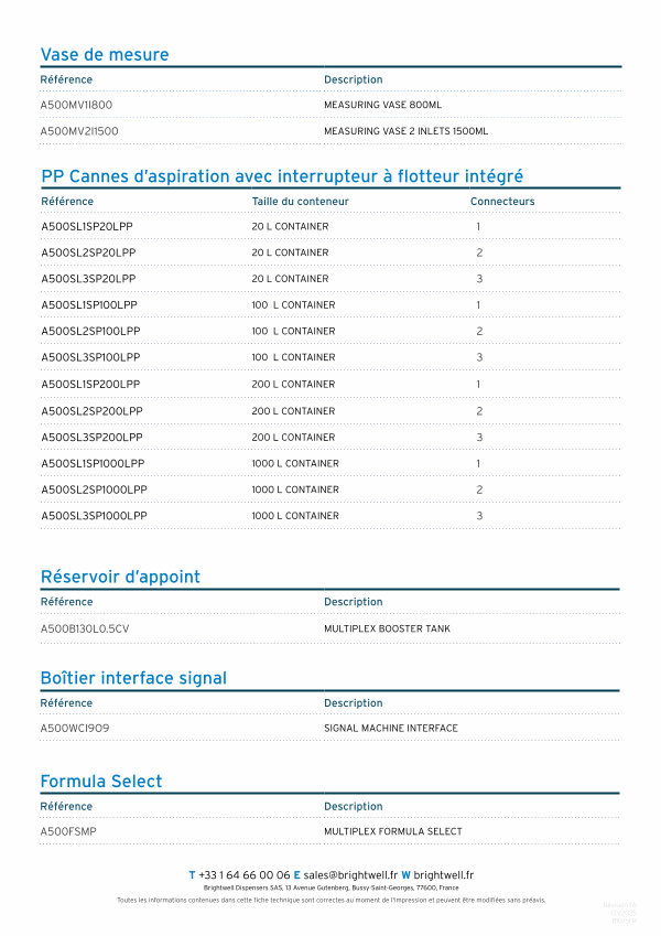 T + 33 1 64 66 00 06 E sales @ brightwell . fr W brightwell . fr Brightwell Dispensers SAS , 13 Avenue Gutenberg , Bussy-Saint-Georges , 77600 , France Toutes les informations contenues dans cette fiche technique sont correctes au moment de l ' impression et peuvent être modifiées sans préavis .