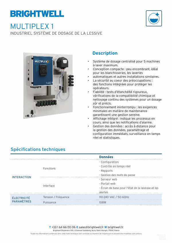 T + 33 1 64 66 00 06 E sales @ brightwell . fr W brightwell . fr Brightwell Dispensers SAS , 13 Avenue Gutenberg , Bussy-Saint-Georges , 77600 , France Toutes les informations contenues dans cette fiche technique sont correctes au moment de l ' impression et peuvent être modifiées sans préavis .