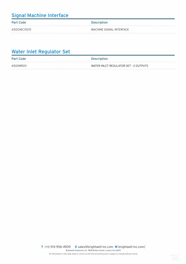 T (+ 1 ) 913-956-4909 E sales @ brightwell-inc . com W brightwell-inc . com / Brightwell Dispensers Inc . 9858 Britton Street , Lenexa , KS , 66219 All information in this data sheet is correct at the time of printing and is subject to change without notice .