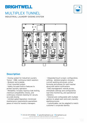 - Dosing system for Industrial Laundry Tunnel - CBW , continuous batch washers - Modular and scalable . - Floor mounted system - Safety focused : built-in features to protect laundry operators - Reliability : includes rigorous leak testing , chemical compatibility checks , and continuous channel cleaning for secure , accurate dosing - Uninterrupted Operation : minimized maintenance requirements guarantees peace of mind for laundry managers