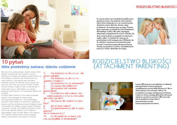 Kilka dni temu przeczytałam artykuł mamy, która blogerki, zwolenniczki wychowania w duchu Montessori. Podobnie jak zabawy, język którym się komunikujemy powinien być dostosowany do wieku dziecka i stymulować jego naturalną potrzebę rozwoju. W artykule „Stop saying: how was your day? And say these 10 things instead” autorka zwraca uwagę na fakt, że pytania jak ci minął dzień, czy co dziś robiłeś są z zasady pytaniami zamkniętymi i nie pobudzają dziecka do myślenia.
