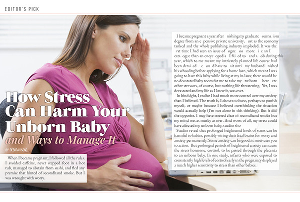 I became pregnant a year after finishing my graduate journalism degree from an expensive private university, just as the economy tanked and the whole publishing industry imploded. It was the first time I had seen an issue of Vogue look more like an IKEA catalogue than an encyclopedia. I failed to land a job during this year, which to me meant my intricately planned life course had been derailed. We would have to wait until my husband finished his schooling before applying for a home loan, which meant I was going to have this baby while living at my in-laws; there would be no decorated baby room for me to raise my first born. There were other stressors, of course, but nothing life threatening. Yet, I was devastated and my life as I knew it, was over. In hindsight, I realize I had much more control over my anxiety than I believed. The truth is, I chose to obsess, perhaps to punish myself, or maybe because I believed overthinking the situation would actually help( I’ m not alone in this thinking). But it did the opposite. I may have steered clear of secondhand smoke but my mind was as murky as ever. And worst of all, my stress could have affected my unborn baby, studies show. Studies reveal that prolonged heightened levels of stress can be harmful to babies, possibly wiring their fetal brains for worry and anxiety permanently. Some anxiety can be good; it motivates you to action. But prolonged periods of heightened anxiety can cause the stress hormone, cortisol, to be passed through the placenta to an unborn baby. In one study, infants who were exposed to consistently high levels of cortisol early in the pregnancy displayed a much higher sensitivity to stress than other babies.