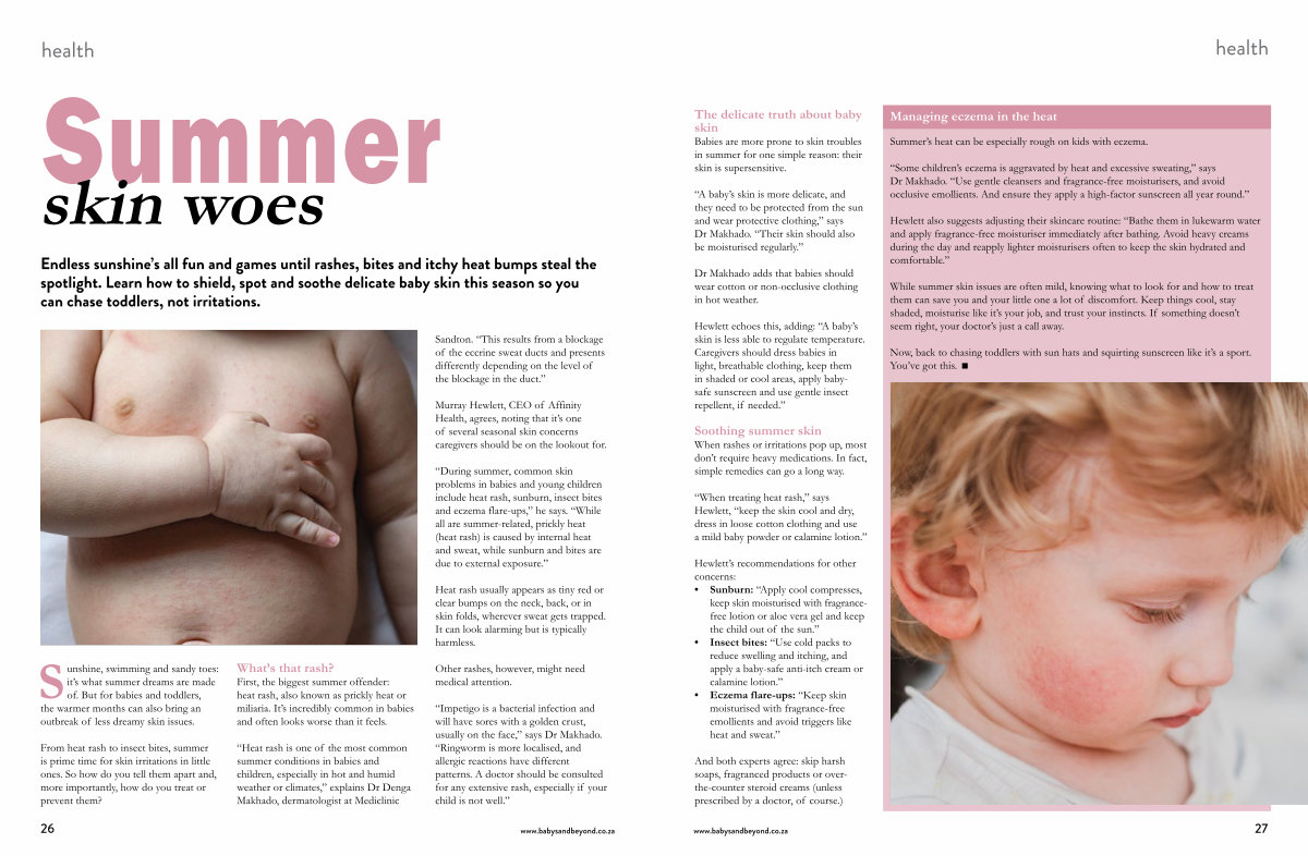 “ Heat rash is one of the most common summer conditions in babies and children, especially in hot and humid weather or climates,” explains Dr Denga Makhado, dermatologist at Mediclinic