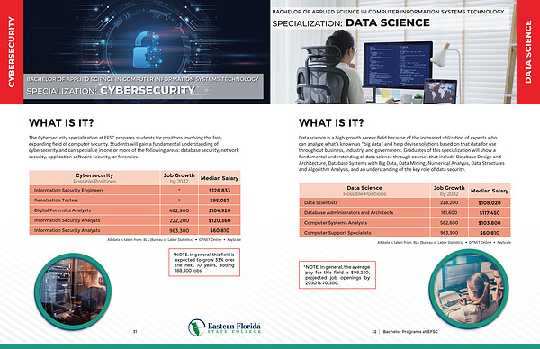 The Cybersecurity specialization at EFSC prepares students for positions involving the fastexpanding field of computer security. Students will gain a fundamental understanding of cybersecurity and can specialize in one or more of the following areas: database security, network security, application software security, or forensics.