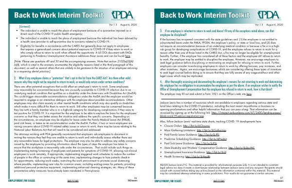 The attorneys working with PDA generally recommend that employers ask employees to document in writing the reasons they feel they are unable to return to work and individually assess whether there are any reasonable bases for legal protections . The employer may also be able to address any safety concerns raised by the employee by providing information about the types of steps the employer has taken to ensure that the workplace is reasonably safe under the circumstances . That could include such things as implementing testing / screening of employees and patients for symptoms of COVID-19 ; allowing non-clinical employees to work remotely , if appropriate ; implementing staggered work schedules to reduce the number of people in the office or commuting at the same time ; implementing changes to how patients check-in for appointments ; reducing work weeks ; restricting the work environment to promote social distancing where possible ; implementing new rules for common areas , including waiting areas for patients ; providing additional personal protective equipment ; implementing enhanced cleaning strategies , etc . Many of these preventative safety measures have already been mandated in Pennsylvania .