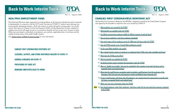 The following FAQs have been prepared to provide guidance as the American Dental Association responds to developments in connection with the 2019 novel Coronavirus / COVID-19 . Jackson Lewis attorneys are monitoring this developing situation , which will continue to evolve during the coming weeks . You should monitor the Centers for Disease Control and Prevention ( CDC ) and the Department of Labor websites for updates and consult with legal counsel as circumstances develop and new issues arise . Answers to these FAQs may vary based on individual circumstances , your policies , applicable state or local laws and the rapidly evolving nature of this public health situation .