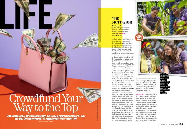 Mallory Brown, 30, has always been happiest living out of her backpack. After studying economics and management in college, she took time to trek through Southeast Asia and South America. The more she traveled, the more she wanted to find a way to connect her wanderlust to her skill set. That led her to founding a company that provides clothes to people in need as well as consulting with global charities.“ I thought that I could use my training, resources, and access to connect businesses and donors with people who need help,” she says. In January 2015, she traveled to Haiti to deliver clothing to people still affected by the devastating 2010 earthquake. While there, she launched her first“ flash fund-raiser”— a campaign in which the goal amount had to be earned in 24 hours and distributed in another day. Brown used the fundraising site CrowdRise to make it happen. The campaign raised $ 10,954, more than double her goal. The money helped move one displaced family into a new home and enroll the children in schools. That success impressed CrowdRise’ s CEO Robert Wolfe, who brought her on board as a partner. She and CrowdRise now run 24-hour challenges for philanthropic efforts around the world, which have included Mexico( for education), Nepal( for disaster relief), Las Vegas