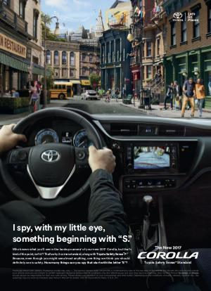 Who knows what you’ ll see in the backup camera 1 of your new 2017 Corolla, but that’ s kind of the point, isn’ t it? That’ s why it comes standard, along with Toyota Safety Sense ™ P. 2 Because, even though you might see almost anything, one thing we think you should definitely see is safety. How many things can you spy that start with the letter“ S”?