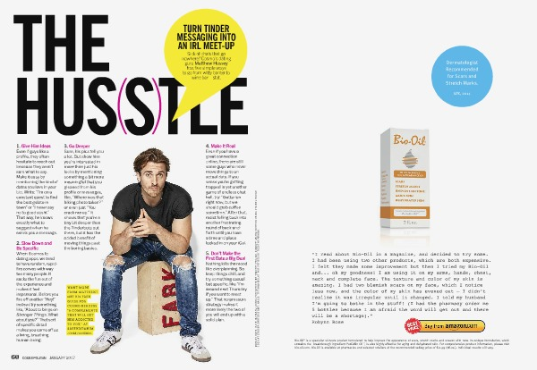 4. Make It Real Even if you have a great connection online, there are still some guys who never move things to an actual date. If you sense you’ re getting trapped in yet another game of endless chat hell, try:“ Gotta run right now, but we should grab coffee sometime.” After that, resist falling back into another frustrating round of back-andforth until you have a time and place locked in on your iCal.