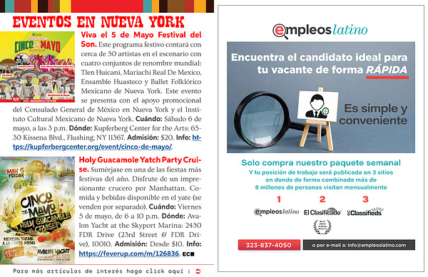 Viva el 5 de Mayo Festival del Son . Este programa festivo contará con cerca de 50 artistas en el escenario con cuatro conjuntos de renombre mundial : Tlen Huicani , Mariachi Real De Mexico , Ensamble Huasteco y Ballet Folklórico Mexicano de Nueva York . Este evento se presenta con el apoyo promocional del Consulado General de México en Nueva York y el Instituto Cultural Mexicano de Nueva York . Cuándo : Sábado 6 de mayo , a las 3 p . m . Dónde : Kupferberg Center for the Arts : 65- 30 Kissena Blvd ., Flushing , NY 11367 . Admisión : $ 20 . Info : https :// kupferbergcenter . org / event / cinco-de-mayo /.