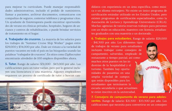 6 . Trabajos para estudiantes . Rango de salario : $ 28,000 - $ 41,500 por año . Los diferentes tipos de trabajos de verano para estudiantes incluyen trabajar como consejero de campamento , salvavidas , empleado de restaurante a tiempo parcial , así como muchos otros puestos en las industrias de la hospitalidad y el turismo . También hay oportunidades de pasantías en una amplia variedad de campos que están disponibles para los estudiantes que terminaron la escuela secundaria o que actualmente están inscritos en la universidad .