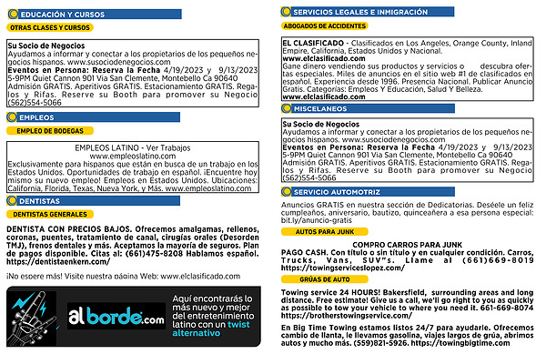 Su Socio de Negocios Ayudamos a informar y conectar a los propietarios de los pequeños negocios hispanos . www . susociodenegocios . com Eventos en Persona : Reserva la Fecha 4 / 19 / 2023 y 9 / 13 / 2023 5-9PM Quiet Cannon 901 Via San Clemente , Montebello Ca 90640 Admisión GRATIS . Aperitivos GRATIS . Estacionamiento GRATIS . Regalos y Rifas . Reserve su Booth para promover su Negocio ( 562 ) 554-5066