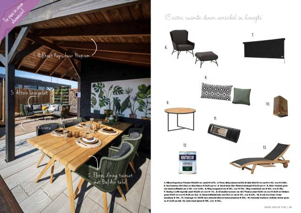 1 . Hillhout Kapschuur Premium 500x300 cm , vanaf e 3.473 , -. 2 . Flores dining tuinset met Bel Air tafel 240x100 cm van e 4.140 , - voor e 3.499 , -. 3 . GeoCeramica 30x120x4 cm Ibiza Bianco e 84,50 per m 2 . 4 . GeoArdesia Alivo Riviera betontegel e 52,50 per m 2 . 5 . Altoro Hoekset groen met strada koffietafel van 4.186 , - voor 3.549 , -. 6 . Wing loungestoel van e 930 , - voor e 789 , -. Wing voetenbank van e 430 , - voor e 359 , -. 7 . Nesling Coolfit rolgordijn zwart 98x240 cm voor e 115 , -. 8 . All weather kussens van 4SO Pinamar zwart 60x30 cm voor e 26,95 en Kitsilano green 50x50 cm voor e 26,95 per stuk . 9 . Strada koffietafel teak rond 58,5 cm van e 270 , - voor e 229 , -. 10 . In-Lite Ace Down Corten wandlamp e 155 , -. 11 . Solamagic S2 1400W nano antraciet infrarood terrasverwarmer e 409 , -. 12 . Hermadix houtdecor verfbeits donker groen va . e 23,95 per blik . 13 . Caldo black ligbed e 565 , - voor e 509 , -.