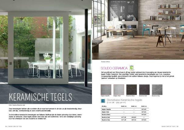 Het assortiment van Stone base is dit jaar verder verbreed door toevoeging van nieuwe keramische tegels ‘ Solido Ceramica ’. Een prachtige ‘ Solide ’ serie keramische terrastegels van 3 cm . massieve , hoogwaardige kwaliteit , gecombineerd met subliem Italiaans design . Deze tegel kun je met al het gemak ‘ gewoon ’ verwerken op straatzand .