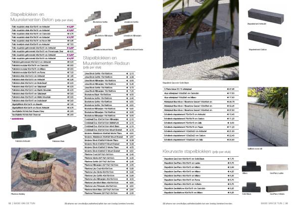 Linea Block Gothic 15x15x30cm e 2,10 Linea Block Gothic 15x15x45cm e 2,99 Linea Block Kilimanjaro 15x15x30cm e 3,50 Linea Block Kilimanjaro 15x15x45cm e 5,25 Linea Block Gothic 15x15x60cm e 3,70 Linea Block Kilimanjaro 15x15x60cm e 7,20 Blockstone Black 15x15x60cm e 4,50 Blockstone Gothic 15x15x30cm e 2,40 Blockstone Gothic 15x15x45cm e 3,50 Blockstone Gothic 15x15x60cm e 4,50 Blockstone Kilimanjaro 15x15x30cm e 4,40 Blockstone Kilimanjaro 15x15x45cm e 6,50 Blockstone Kilimanjaro 15x15x60cm e 8,50 Combiwall Duo 30x10x10cm Kilimanjaro e 2,18 Combiwall Duo 30x10x10cm Matterhorn e 2,18 Combiwall Duo 30x10x10cm Mont Blanc e 2,18 Combiwall Duo 30x10x10cm Mount Everest e 2,18 Moderno Afdekblock 30x60x6 Monte Titano e 4,50 Moderno Afdekblock 30x60x6 Mount Everest e 4,50 Moderno Block 30x60x15 Monte Titano e 8,99 Moderno Block 30x60x15 Mount Everest e 8,99 Moderno Block 30x60x7,5 Monte Titano e 4,50
