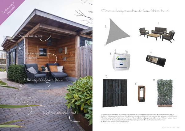1 . Douglashouten overkapping . 2 . Wing loungestoelen ( all weather ) en voetenbank van 4 Seasons Outdoor . 3 . Betontegel GeoStretto Milano 60x60x4 cm . 4 . Nieuw gebakken waalformaat Clare . 5 . Col-met cortenstalen randafwerking . 6 . Schaduwdoek Nesling driehoek 3.6x3.6x3.6 m grijs . 7 . Capitol Living tuinset ( all weather ) met teak koffietafel van 4 Seasons Outdoor . 8 . Bigbag straatzand . 9 . Solamagic 1400 eco + antraciet infrarood terrasverwarmer . 10 . Grenen geschaafd 18 planks 180x180 cm zwart gedompeld 11 . In-Lite Ace corten staande buitenlamp . 12 . Mobilane Kant-en-klaar hedera haag 120x180 cm .