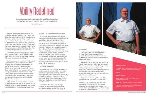 Slattery hopes to one day host up to 100 hacking teams at the Baltimore Convention Center, an event that will include speakers, digital / engineering wizards, even employers. He’ s also working with volunteer architects to build another disabledaccessible home, the first of what he hopes will be many such houses.