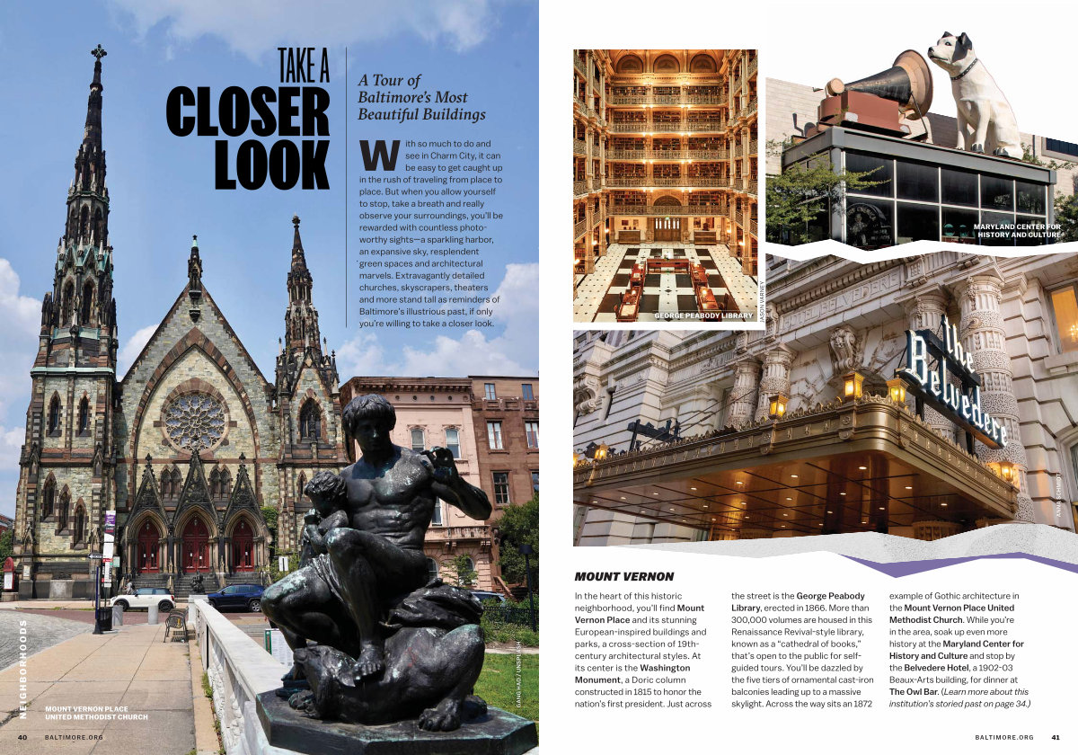 With so much to do and see in Charm City, it can be easy to get caught up in the rush of traveling from place to place. But when you allow yourself to stop, take a breath and really observe your surroundings, you’ ll be rewarded with countless photoworthy sights— a sparkling harbor, an expansive sky, resplendent green spaces and architectural marvels. Extravagantly detailed churches, skyscrapers, theaters and more stand tall as reminders of Baltimore’ s illustrious past, if only you’ re willing to take a closer look.